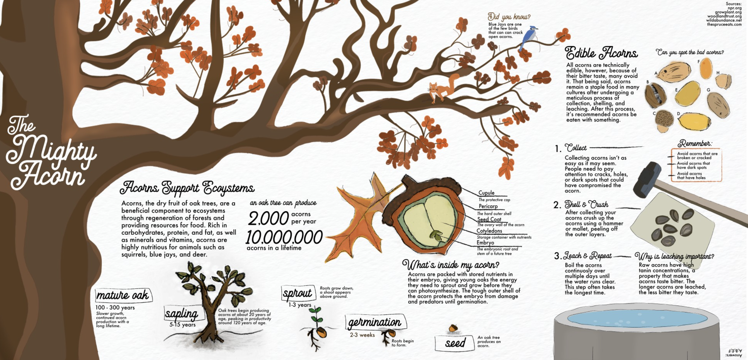 This infographic is an educational infographic on the importance of acorns on ecosystem services. I was inspired to create this piece after after taking a geography class at UNC-Chapel Hill. I combined both my organic art and digital illustrations to create the illustrations for this infographic.